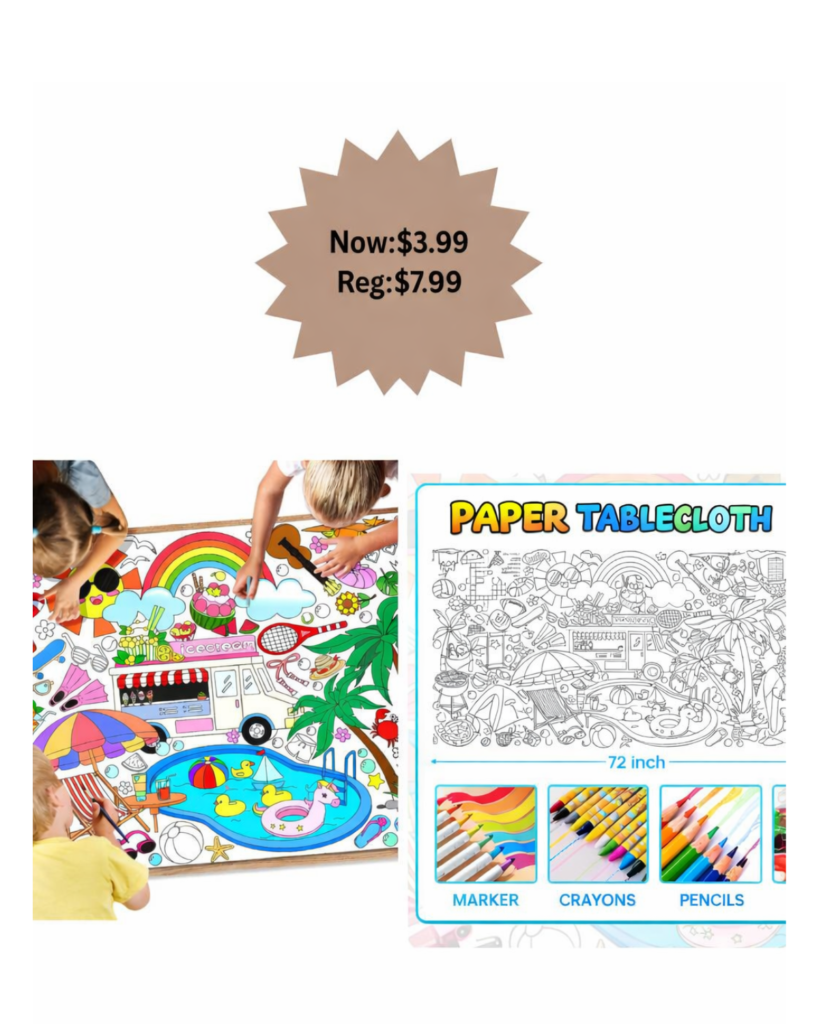 Turn any table into a creative playground with this Giant 35×72″ Kids Coloring Poster — now an amazing 50% OFF! Perfect for summer activities, parties, classrooms, and family fun, this oversized coloring tablecloth features pool, sun, BBQ, and summer‑themed designs that keep kids entertained for hours. It doubles as a DIY art mat, party table cover, and craft activity, making it a versatile must‑have for parents and teachers.